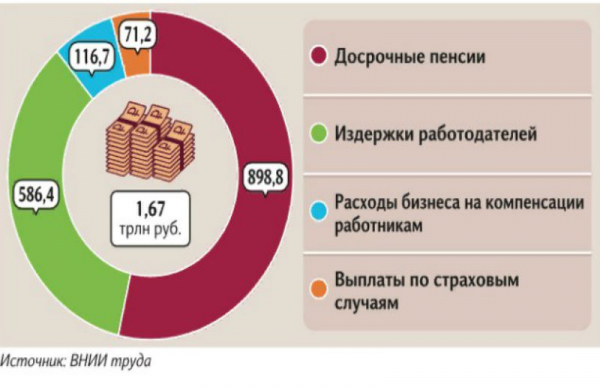 В прошлом году Пенсионный фонд России потратил 898,8 миллиарда рублей на выплату досрочных пенсий людям, работавшим на вредных производствах, а Фонд социального страхования выплатил 71,2 миллиарда рублей по страховым случаям, указано в материалах ВНИИ труда. Как указали специалисты института, работодатели потратили 116,7 млрд рублей на компенсации сотрудникам плюс недополучили 586,4 млрд рублей выручки из-за потерь рабочего времени (и, следовательно, снижения производства продукции или услуг).