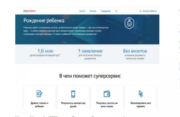 С помощью суперсервиса родители смогут по одному заявлению и без визитов в госорганы получать весь комплекс госуслуг и выплат, предусмотренных в период с беременности до записи ребенка в детский сад. Так, уже с 2020 года можно будет оформить электронное свидетельство о рождении, СНИЛС, ИНН, полис ОМС, свидетельство о регистрации по месту жительства, а также сертификат на материнский капитал. Кроме того, будет доступна запись в детский сад, онлайн-отслеживание очереди в него и электронное оформление пособий, связанных с рождением ребенка.