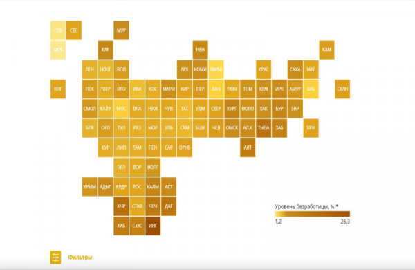 Самый низкий уровень по безработице в Москве, Санкт-Петербурге и Ямало-Ненецком автономном округе. В столице уровень безработицы находится на отметке 1,2%, в Санкт-Петербурге - 1,4%, Ямало-Ненецком автономном округе - 2,2%. На четвертой позиции оказались Хабаровский край и Ханты-Мансийский автономный округ – Югра с показателем 2,5% .