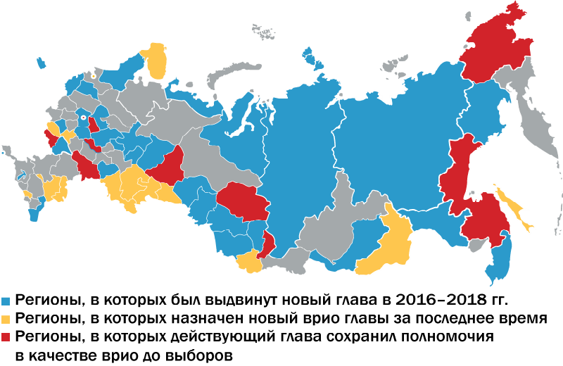 Кроме того, ряд глав регионов были заменены на врио в преддверии единого дня голосования — 2019. На конец марта 2019 года такая замена прошла в 14 регионах.