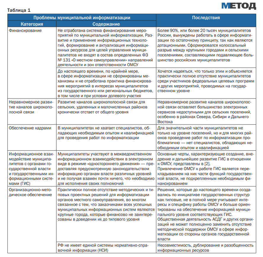 Основные проблемы и трудности муниципальной информатизации, к сожалению, уходят к истокам формирования местного самоуправления в его нынешнем виде, и со временем тенденция их преодоления не только не прогрессирует, но и появляются все новые факторы, осложняющие и без того непростую работу органов местного самоуправления (ОМСУ) в данном направлении [1] (таблица 1).