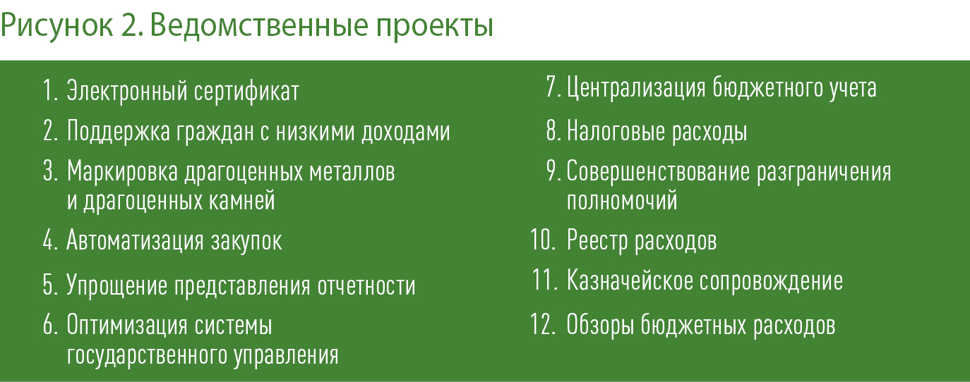 Подробная информация о ведомственных проектах доступна на официальном сайте Минфина России в разделе «Проектная деятельность» (minfin.ru/ru/perfomance/ projects/departmental).