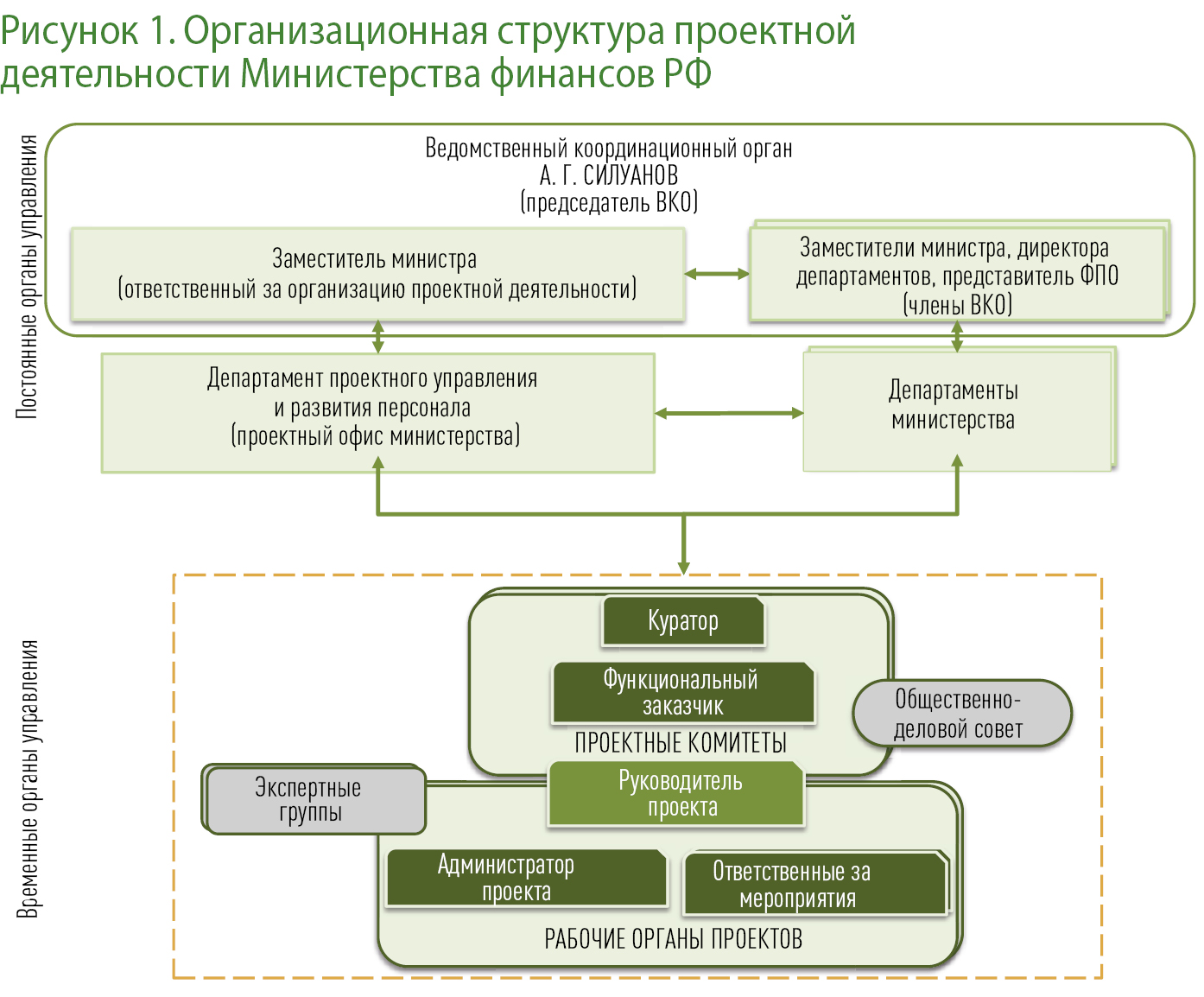 Организационная структура проектной деятельности в Минфине России представлена на рисунке 1. Высший орган управления этой деятельностью — Координационный орган возглавляет первый заместитель председателя Правительства РФ — министр финансов А. Г. Силуанов. В состав органа также входят все заместители министра и ряд руководителей департаментов.