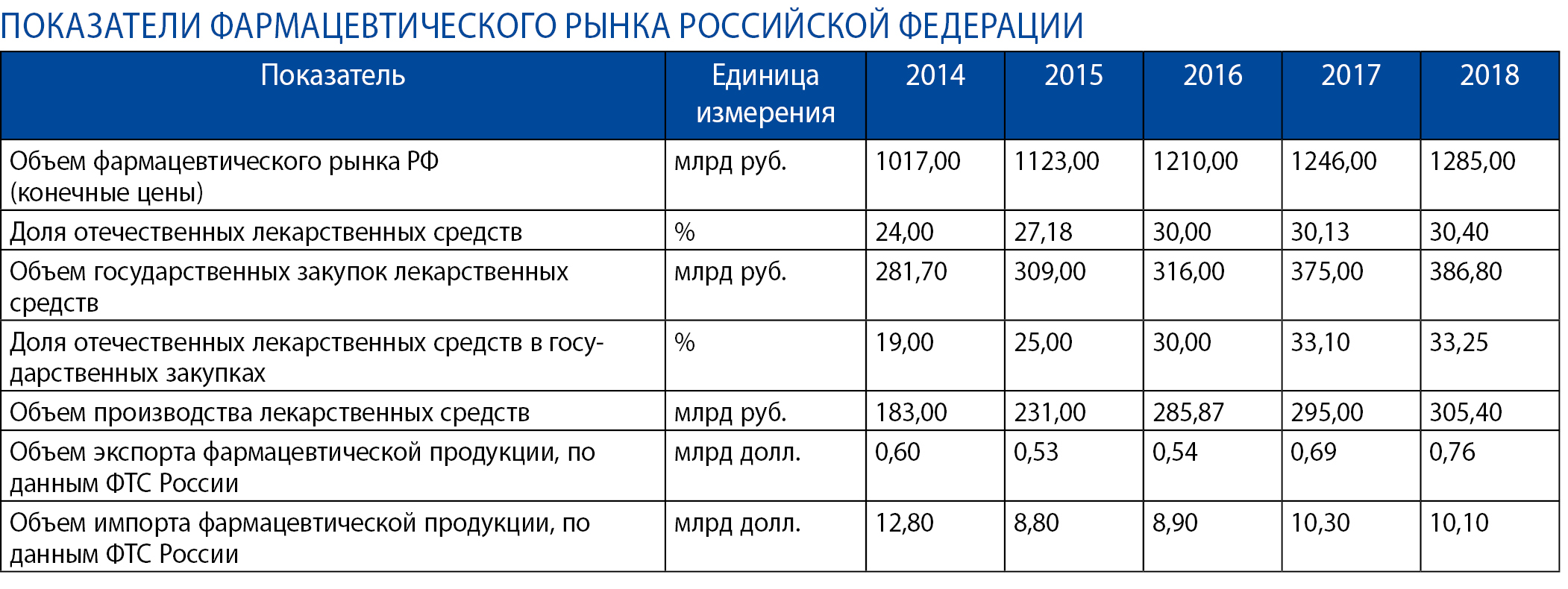 В прошлом году объем рынка лекарств увеличился на 3,1% по отношению к 2017 году и составил 1,285 миллиарда рублей (5,2 миллиарда единиц в упаковках). Доля отечественного производства лекарств в общем объеме рынка составила 61,42% в натуральном выражении и 30,4% — в стоимостном, а общий объем производства превысил 305 миллиардов рублей. До 760 миллионов рублей увеличился экспорт лекарств.