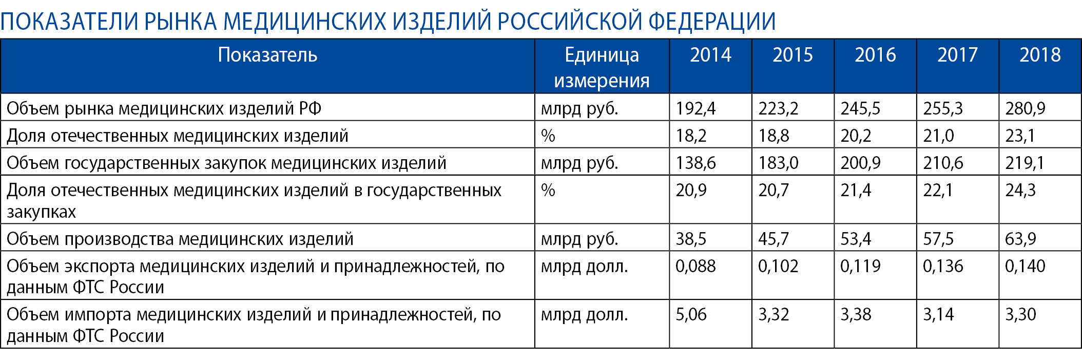 В настоящее время медицинские изделия в России выпускают около 550 компаний преимущественно малого и среднего бизнеса (около 98% в общем количестве). В производстве медицинских изделий занято около 30 предприятий оборонно-промышленного комплекса, более 20 иностранных компаний, локализовавших производство на российской территории