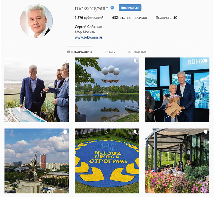 Согласно обзору «Ленты.ру», ряд исследований активности губернаторов в соцсетях показывает, что именно Instagram стал основной площадкой для активности глав регионов, хотя многие управленцы присутствуют на нескольких площадках. У ряда глав регионов контент в разных соцсетях различается. Например, у мэра Москвы С. С. Собянина достаточно динамичный аккаунт в «Инстаграме» (более 610 тысяч подписчиков на июль 2019 года) и более сухой и официальный в «ВКонтакте» (более 330 тысяч подписчиков). К примеру, в «Инстаграме» Собянина присутствуют такие неформальные вещи, как фото с рыбалки и поздравления рыбакам: «С праздником, рыбаки, ни хвоста ни чешуи! <...> c годами эмоции притупляются, но все равно рыбалка — очень душевное занятие». Очень разный отклик аудитории мэра на этих площадках: достаточно позитивный в «Инстаграме» и преимущественно негативный в «ВКонтакте» (далее — «ВК»). Возможно, именно в связи с этим возможность отправки сообщений в «ВК» ограничена, а в «Инстаграме» — открыта. Как отмечают эксперты, таковы особенности аудиторий разных соцсетей — «инста» в целом более дружелюбен.